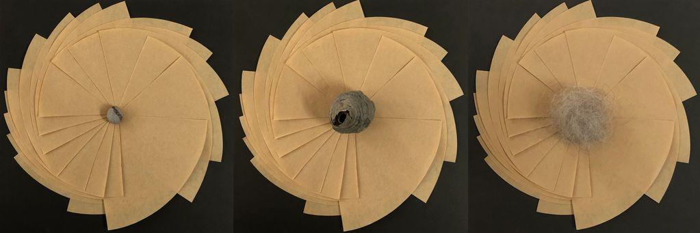 Paper coffee filters with Ogham Rune Stone, Hornet Nest, and Human Hair.