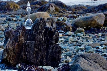 These works view living edges through discarded, hand-blown laboratory glass, prisms, and lenses.